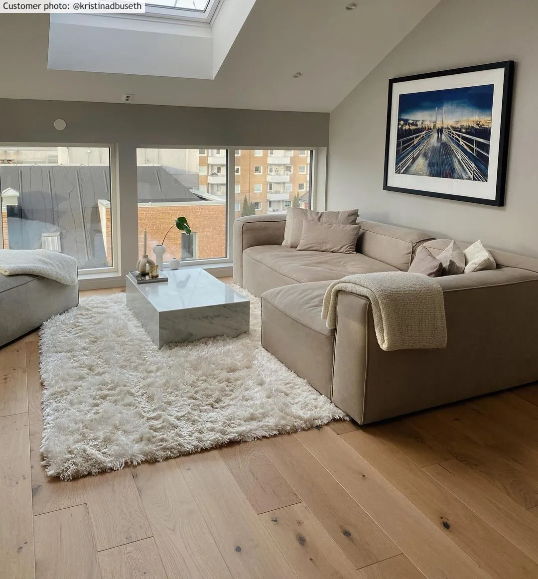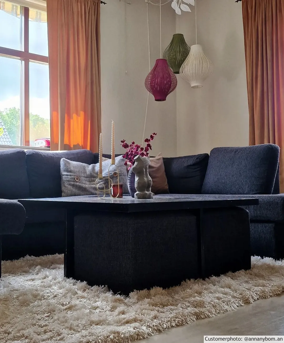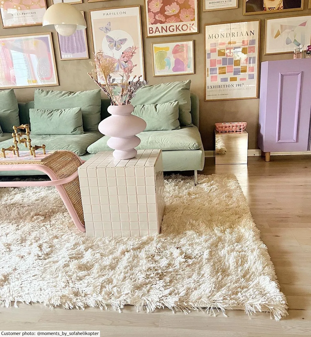 Tapijt van Rya. Zacht, dicht, indrukwekkende pool. Glanzende draden worden afgewisseld met matte en geven een levendig, golvend Rya tapijt.