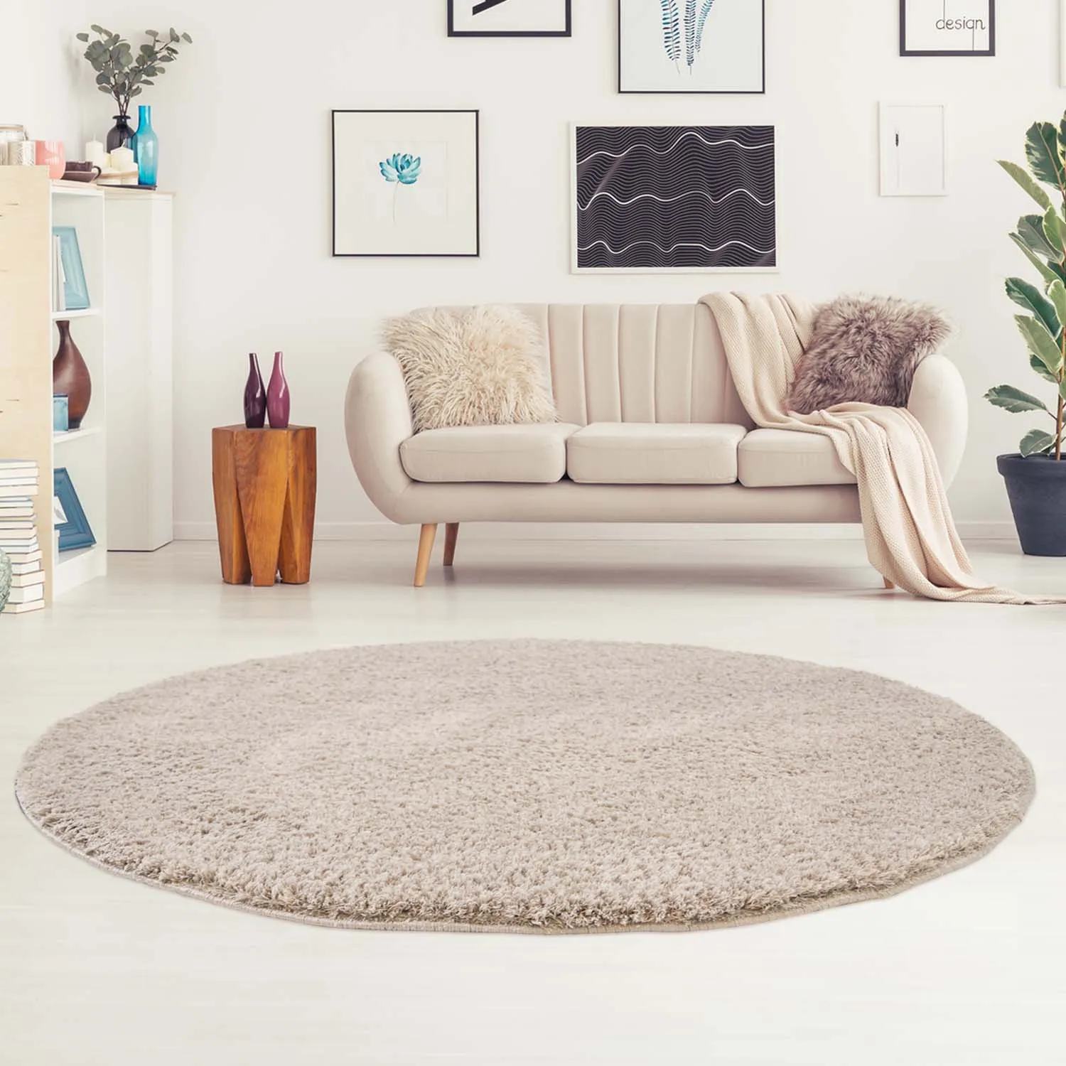 Hoogpolig vloerkleed met lange en dichte pool, hier in ronde vorm. Glanzende draden worden afgewisseld met monochroom, waardoor een levendig en vloeiend hoopolig vloerkleed ontstaat. Laat je voeten zacht en comfortabel landen terwijl je rondloopt op dit huiselijk, hoogpolig vloerkleed. Het vloerkleed past net zo goed onder het bed in de slaapkamer als in de woonkamer of als kindervloerkleed. Hier zie je het vloerkleed in de kleur beige.