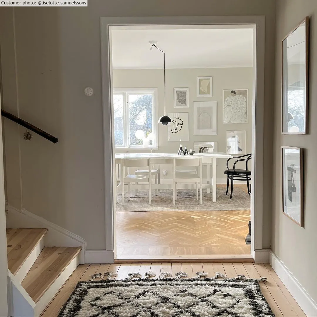 Plat geweven vloerkleed van wol. Wollen vloerkleed met dunne, mooie snit. Geweldige kwaliteit. Makkelijk te verplaatsen. Ligt stevig en plat op de vloer. Geeft een gevoel van originaliteit.